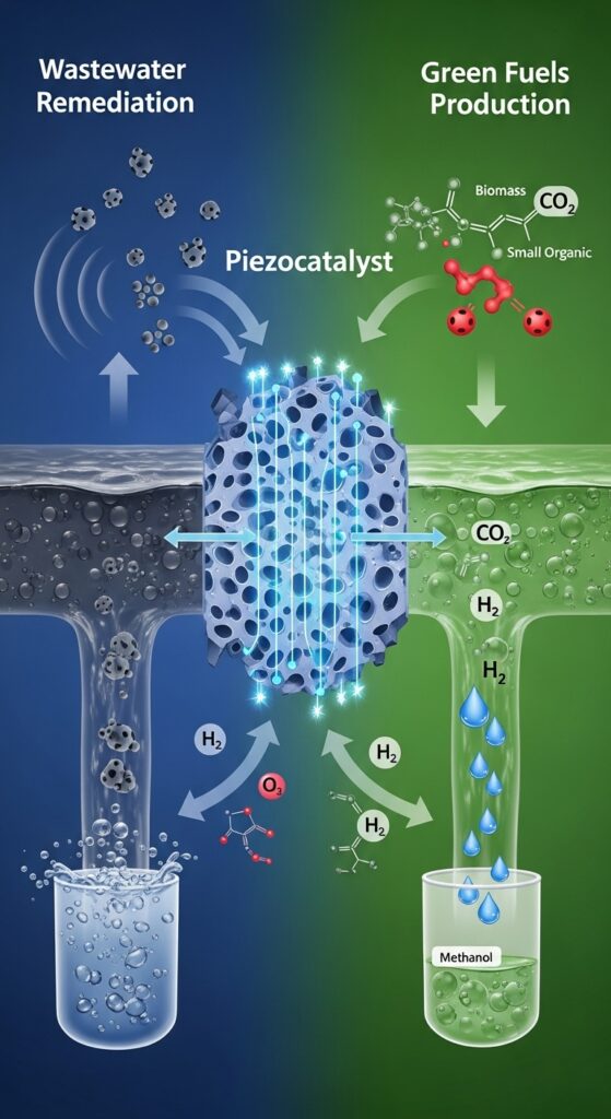 Piezocatalysis for wastewater remediation and green fuels production